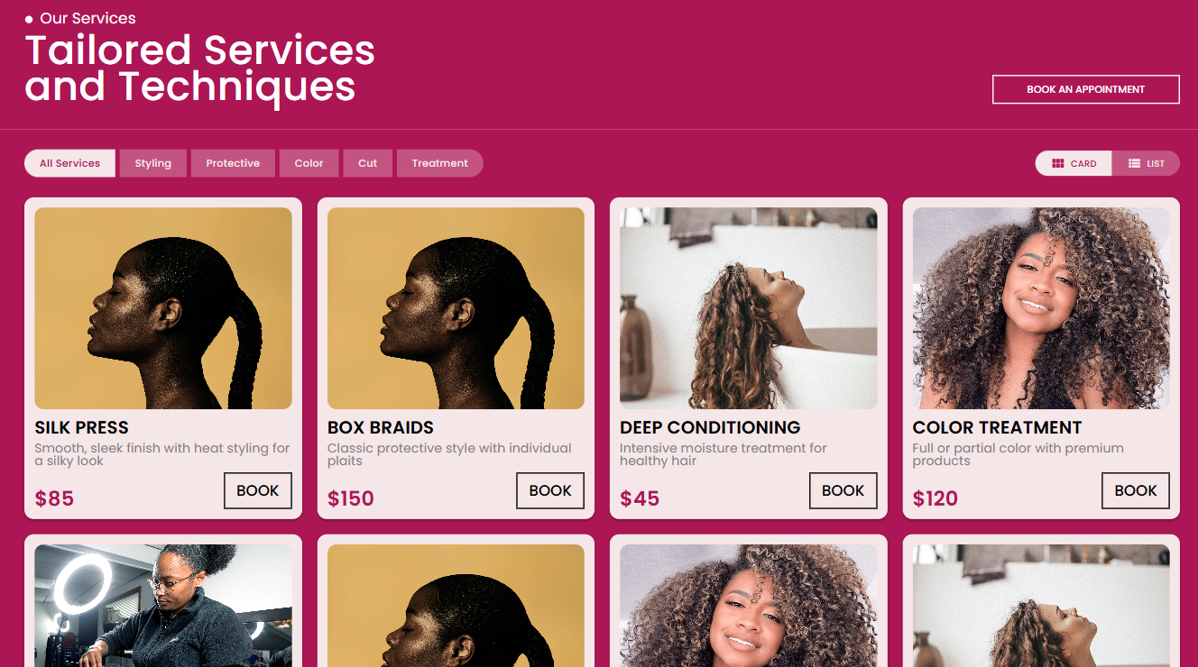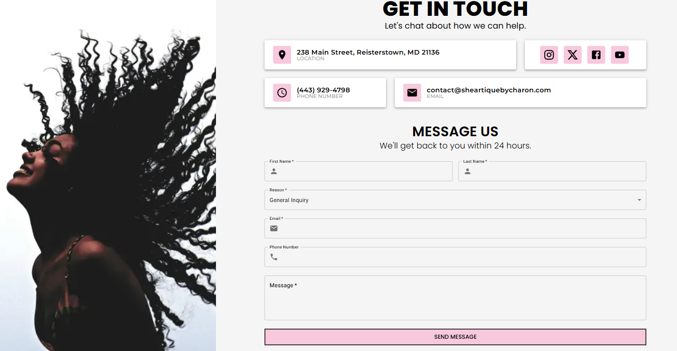 A local hairstyling business website designed to present services, brand personality, and contact information. The site provides a clean, approachable digital presence for a growing boutique in Reisterstown, Maryland.